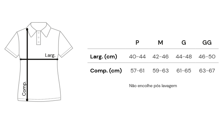 Composição: 50% de algodão e 50% de poliéster, malha piquet, costura dupla, gola em retilínea.