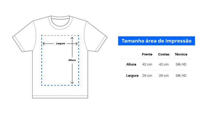 Testado nas ruas. Vestido com orgulho. Para garantir a qualidade final da impressão recomendamos que você siga o nosso artigo de Orientações para camisetas. Percentual de encolhimento pós lavagem: Comprimento 4/7% Largura 3/5%. Atenção: As medidas podem variar um pouco, até 3cm pra mais ou pra menos. Técnica de impressão: Silk Digital HD. Composição: 100% algodão, meia malha penteada, costura reforçada, gola em ribana, 165g, fio 30.1. Cores do produto: Como cada tela de computador ou celular tem seu próprio jeito de mostrar cores, então a cor da sua camiseta e da estampa pode ser um pouco diferente do que você viu online.
